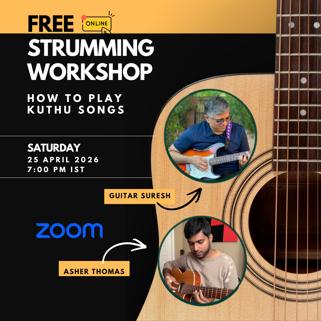 Join Guitar Suresh and Asher for a fun, beginner-friendly live workshop where we break down the strumming patterns that power Tamil kuthu songs.